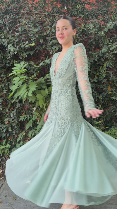 Vestido midi con encaje bordado y detalles en 3d.